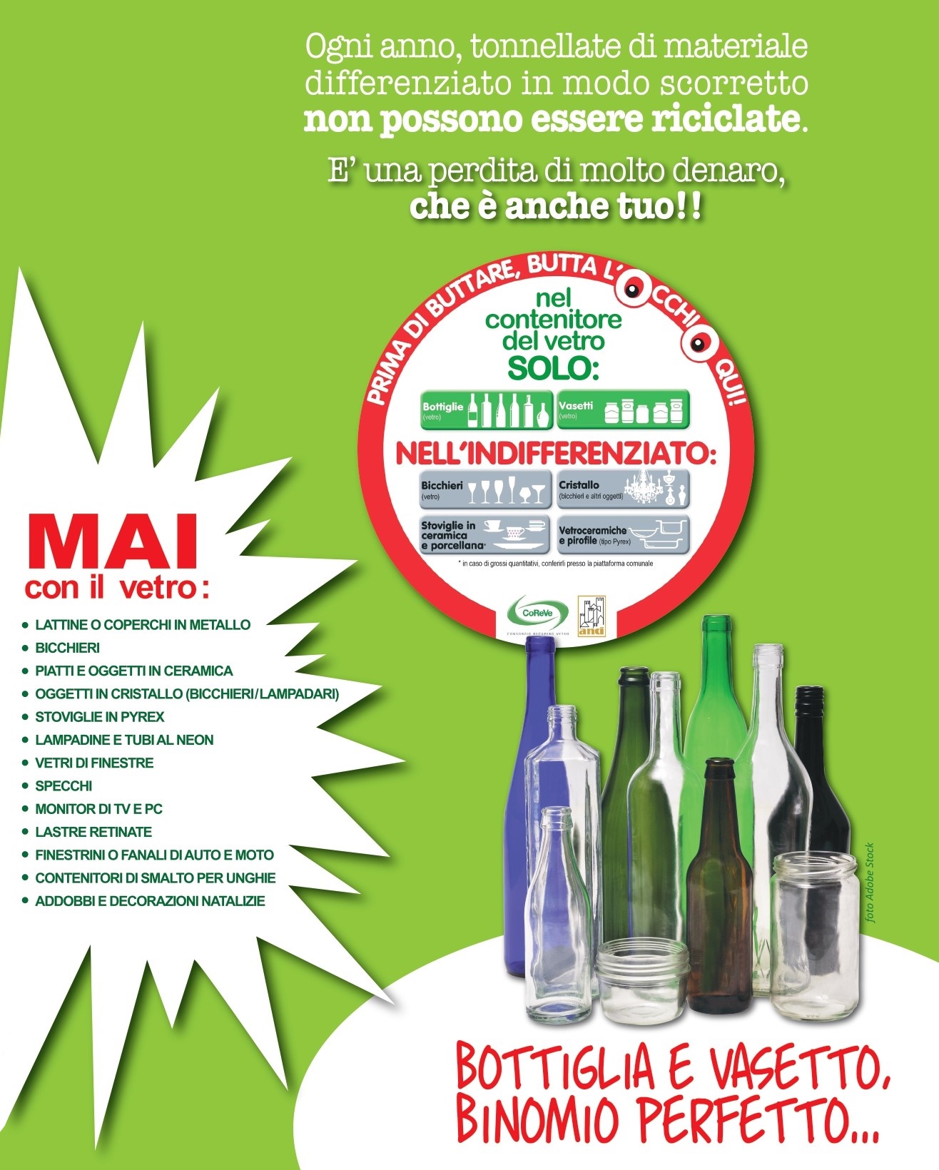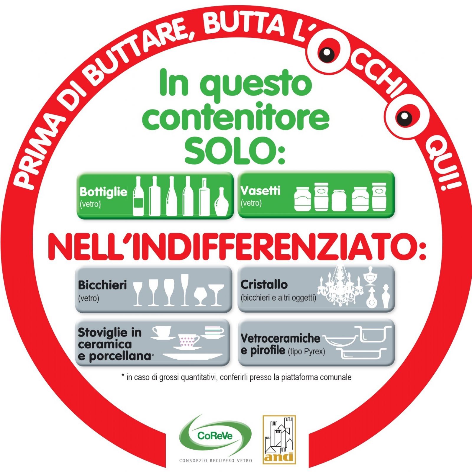 Ricordati di gettare nel contenitore del vetro solo bottiglie e vasetti: pirofile in pyrex e in vetroceramica, bicchieri, oggetti di cristallo, stoviglie in ceramica e/o porcellana... vanno buttati nell'indifferenziato!